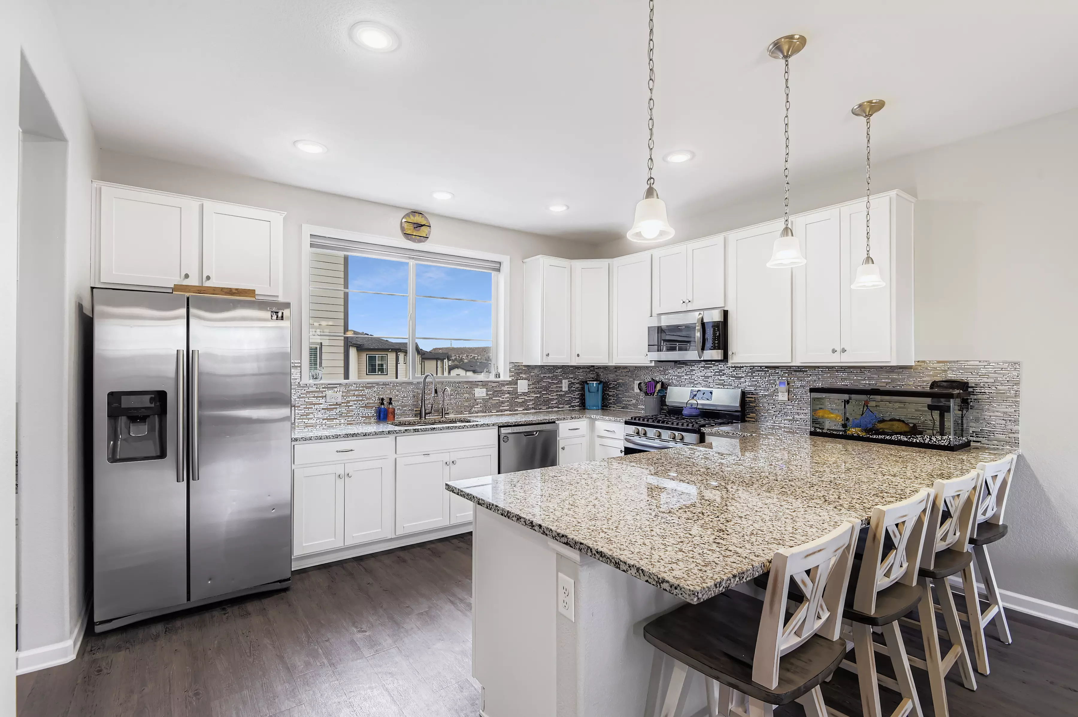 Step inside this stylish 2018-built townhome and experience the perfect blend of modern design and Colorado lifestyle. The bright, open floorplan features a spacious kitchen with solid surface countertops, stainless steel appliances, shaker-style cabinetry, a large eat-at counter, and walk-in pantry—flowing seamlessly into the dining area and great room with a cozy modern fireplace. An east-facing balcony offers the perfect setting for morning coffee or weekend brunch.